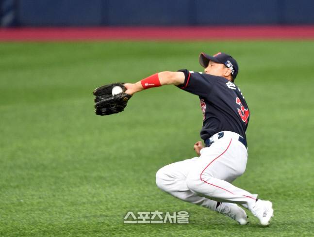 톳데 우익수 손아섭이 26일 2021프로야구 키움 히어로즈와 롯데 자이언트의 경기 1회말 키움 2번 송성문의 안타성 타구를 슬라이딩해 잡아내고 있다. 2021.09.26.