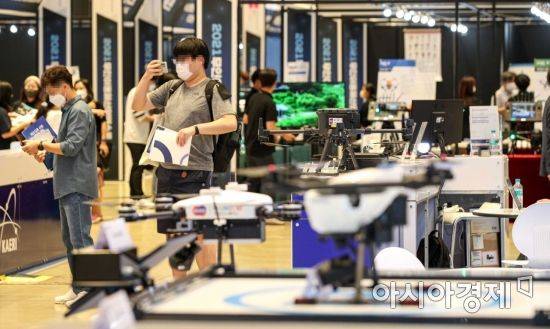 26일 서울 강남구 코엑스에서 열린 '2021 무인이동체산업엑스포'에서 다양한 드론 및 무인이동체가 전시되고 있다./강진형 기자aymsdream@