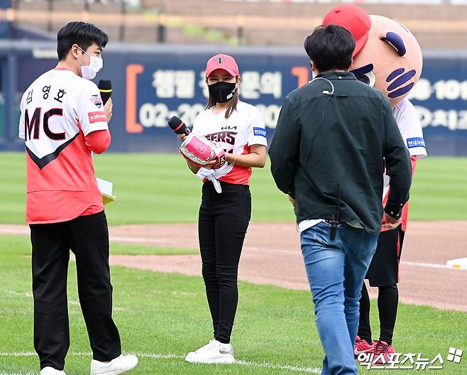 (엑스포츠뉴스 광주, 김한준 기자) 26일 오후 광주-기아 챔피언스필드에서 열린 '2021 신한은행 SOL KBO리그' SSG 랜더스와 KIA 타이거즈의 경기, 경기 전 가수 송가인이 시구에 임하고 있다.