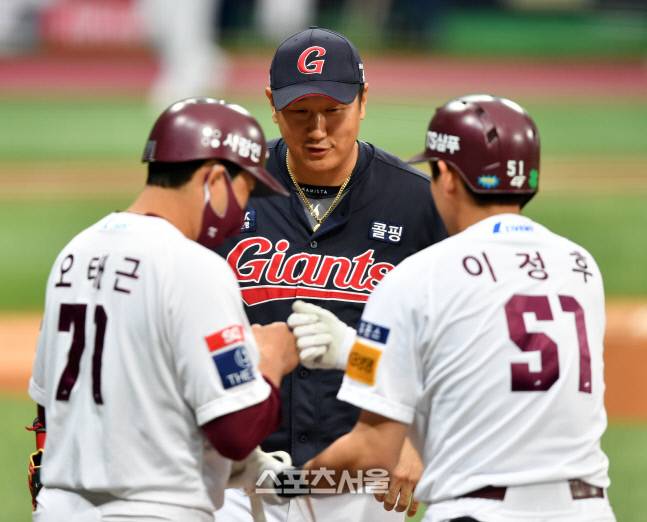 톳데 1루수 이대호가 26일 2021프로야구 키움 히어로즈와 롯데 자이언트의 경기 1회말 키움 3번 이정후가 2사후 안타로 출루하자 말을 건네고 있다. 2021.09.26.