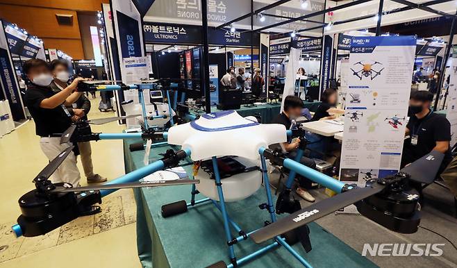 [서울=뉴시스] 홍효식 기자 = 26일 서울 강남구 코엑스에서 열린 2021 무인이동체산업엑스포에 드론이 전시돼 있다. 이번 박람회는 28일(화)까지 진행한다. 2021.09.26. yesphoto@newsis.com