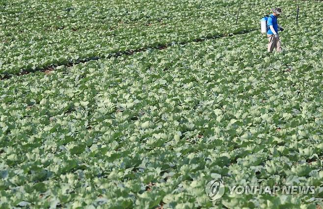 (제주=연합뉴스) 박지호 기자 = 26일 제주시 애월읍 중산간의 한 밭에서 농민들이 양배추에 방제작업을 하고 있다. 2021.9.26