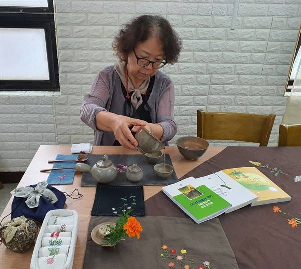 | ▲ 다도는 마음을 평화롭게 합니다 이숙자 선생님은 30년의 다도생활과 자수가 글쓰기의 원천이 되었다고 말씀하셨다. |