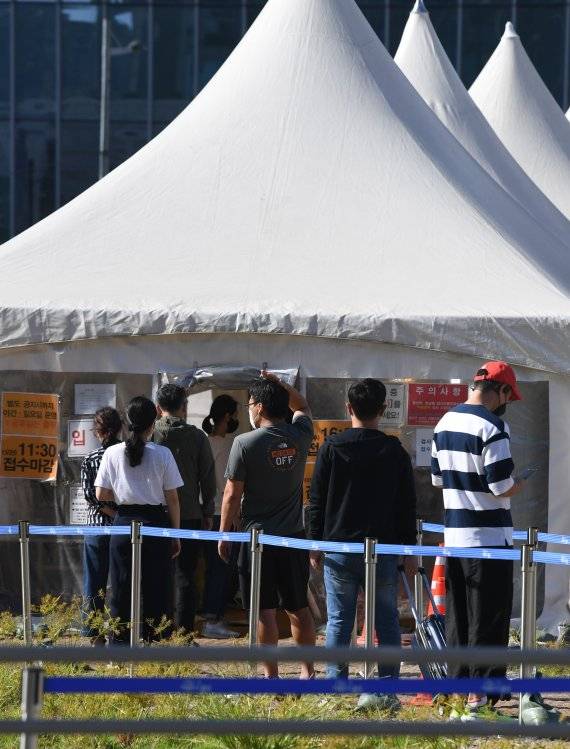 26일 서울 용산역 앞에 마련된 코로나19 선별진료소에서 시민들이 검사를 받기 위해 대기하고 있다. 질병관리청 중앙방역대책본부는 이날 0시 기준 코로나19 신규 확진자가 2771명 발생했다고 밝혔다. 전날 확진자는 3273명으로 역대 최다 확진자가 발생하고 하루만에 두 번째 규모를 기록했다. 사진=김범석 기자
