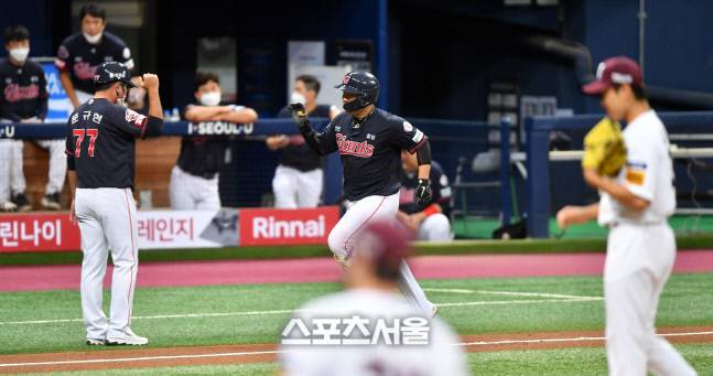 롯데 8번 지시완이 26일 2021프로야구 키움 히어로즈와 롯데 자이언트의 경기 4회초 2사 1루에서 추격 2점홈런을 터트린후 홈인하고 있다. 2021.09.26.