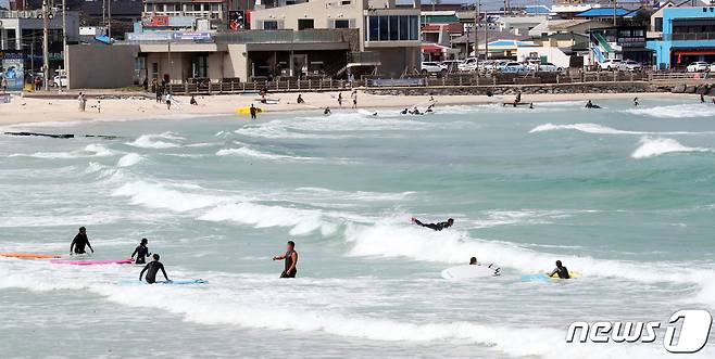 (제주=뉴스1) 오현지 기자 = 26일 오전 제주시 구좌읍 월정해수욕장에서 서퍼들이 파도를 타고 있다. 2021.9.26/뉴스1