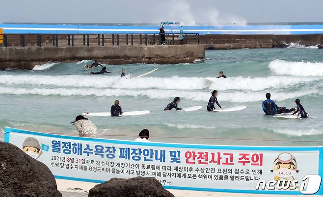 (제주=뉴스1) 오현지 기자 = 26일 오전 제주시 구좌읍 월정해수욕장에서 서퍼들이 파도를 타고 있다. 2021.9.26/뉴스1