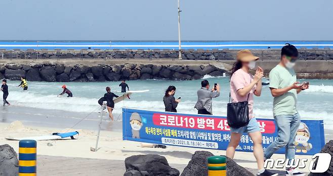(제주=뉴스1) 오현지 기자 = 관광객들과 서퍼들이 26일 오전 제주시 구좌읍 월정해수욕장에서 여유를 즐기고 있다. 2021.9.26/뉴스1