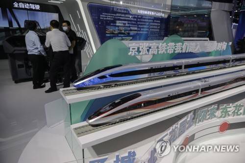 epa09489074 Visitors stand beside models of CRH trains at the China Beijing International High-Tech Expo (CHITEC) in Beijing, China, 26 September 2021. The expo presents China's latest technological achievements from 24 to 28 September 2021. EPA/WU HONG