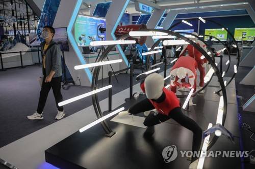 epa09489078 A visitor walks past an exhibition booth displaying Winter Olympics-related technology at the China Beijing International High-Tech Expo (CHITEC) in Beijing, China, 26 September 2021. The expo presents China's latest technological achievements from 24 to 28 September 2021. EPA/WU HONG