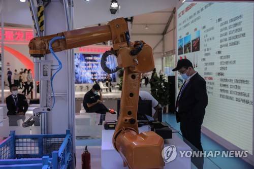 epa09489081 A man looks ta a mechanical arm at the China Beijing International High-Tech Expo (CHITEC) in Beijing, China, 26 September 2021. The expo presents China's latest technological achievements from 24 to 28 September 2021. EPA/WU HONG