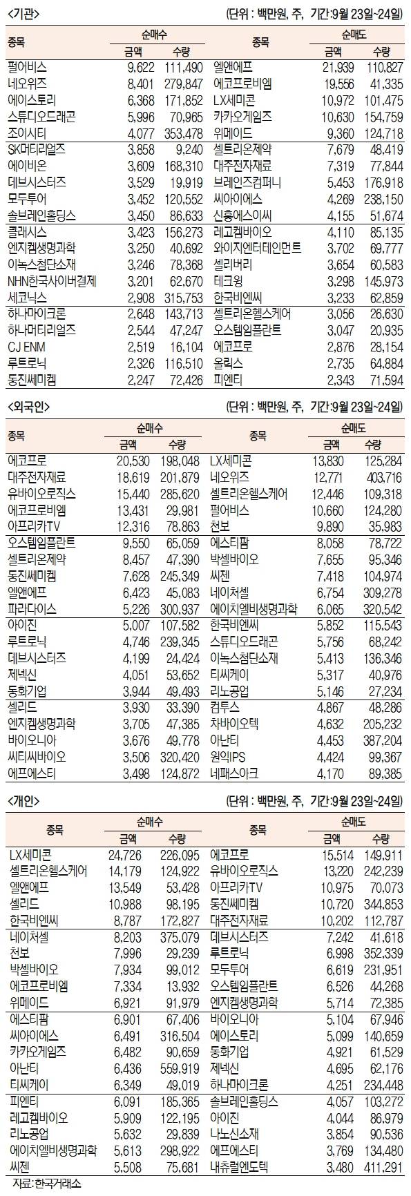 [표]주간 코스닥 기관·외국인·개인 순매수·도 상위종목(9월 23~24일)