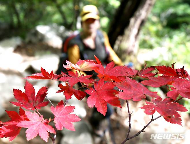 [양양=뉴시스] 김경목 기자 = 26일 오후 등산객이 강원도 양양군 설악산 국립공원 남설악 탐방로를 내려오며 빨갛게 물든 단풍을 바라보고 있다. 올해 단풍은 온난화의 요인으로 예년보다 늦게 물들기 시작했다. 2021.09.26. photo31@newsis.com