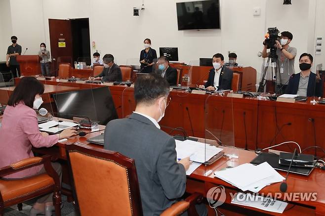 (서울=연합뉴스) 진성철 기자 = 더불어민주당 김용민 의원(오른쪽 두번째)이 26일 서울 여의도 국회에서 열린 언론중재법 8인 협의체 회의에서 발언하고 있다. 2021.9.26 [국회사진기자단]