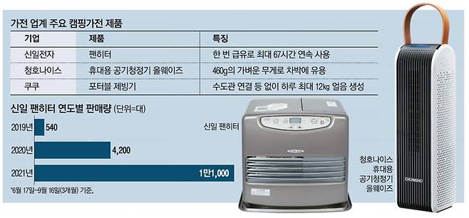 신일전자의 '신일 팬히터'는 등유 난로에 팬을 내장한 난방가전으로 매년 캠핑족에게 큰 사랑을 받으며 '캠핑 필수가전'에 등극한 스테디셀러다. 이 제품은 팬이 실내 공기를 빠르게 순환시켜 일반 난로에 비해 난방 효율이 높은 점이 장점이다.
