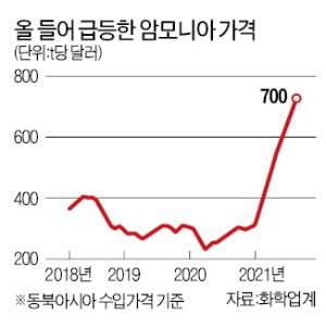 지난해 말부터 반도체 수요 증가 등으로 질산 공급은 수요를 따라잡지 못하고 있다. 가격도 치솟고 있다. 질산의 원료가 되는 암모니아 가격은 이달 들어 t당 700달러 선까지 올랐다. 2014년(566달러) 이후 7년 만의 최고치다. 300달러 초반대였던 올초 대비 두 배 이상으로 급등했다.