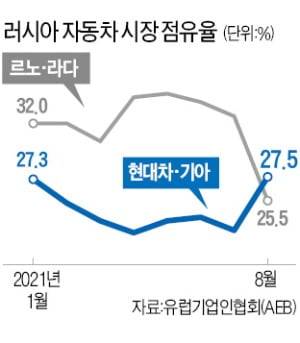현대자동차·기아가 지난달 러시아 자동차 시장에서 점유율 1위에 올랐다. 유력 경쟁사인 프랑스 르노그룹이 러시아 완성차업체 아브토바즈를 인수해 브랜드로 편입시킨 2017년 1월 이후 월 기준으로 처음이다.
