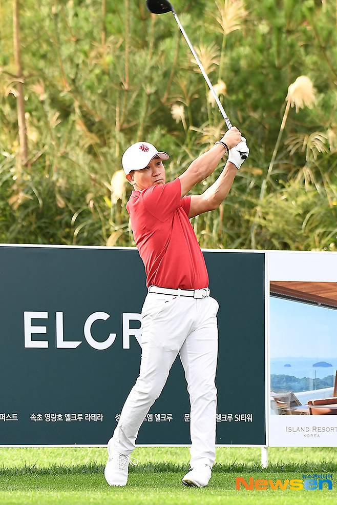 이날 여홍철 전 기계체조선수가 1번홀에서 티샷을 날리고 있다.