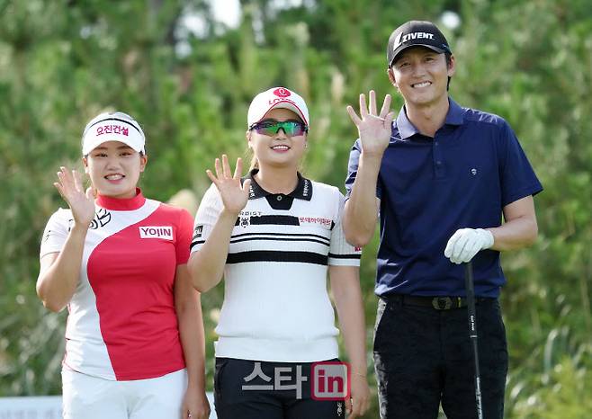 [이데일리 골프in(안산)=조원범 기자]26일 경기도 안산시 대부도에 위치한 아일랜드CC에서 '엘크루-TV조선 프로 셀러브리티 2021'(총상금6억원,우승상금1억8백만원)최종라운드가 열렸다.노승희,최혜진,이정진이 1번홀에서 경기를 하고 있다..