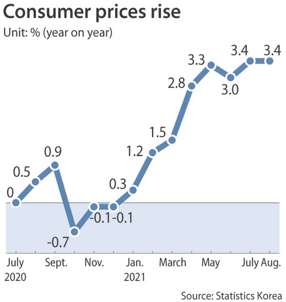 Consumer prices have been rising by more than 2 percent on year each month since April, according to Statistics Korea. The prices of 141 items frequently purchased by consumers rose by 3.4 percent compared to last year in both July and August, the highest rates of increase this year.