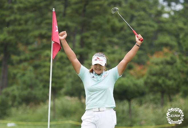 (서울=연합뉴스) 유해란이 26일 안산 대부도 아일랜드CC에서 열린 '엘크루-TV조선 프로 셀러브리티'에서 우승한 뒤 기뻐하고 있다. 2021.9.26