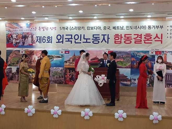 베트남, 캄보디아, 스리랑카, 인도네시아, 중국 등 5쌍의 이주노동자들이 이날 부부의 연을 맺었다.