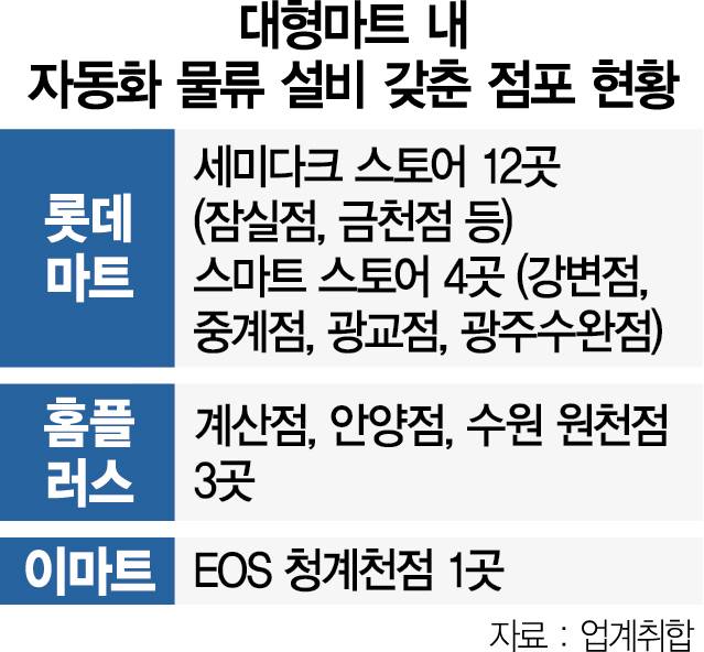 롯데마트가 지난해 매장 배송의 거점화를 위해 시작한 세미다크 스토어는 ‘피킹’은 사람이 직접 하지만 배송 전 단계인 ‘패킹’은 후방에 구축된 자동 물류 설비에서 진행하는 형태를 말한다. 스마트스토어는 매장 천장에 상품이 이동할 수 있는 레일을 설치해 피킹과 패킹 모두를 자동화 설비로 해결하는 매장을 일컫는다. 두 가지 모두 대형마트가 오프라인 영업뿐 아니라 온라인 주문 처리 능력까지 확보할 수 있어서 효율적이라는 평가를 받았다. 하지만 롯데마트 측은 “기존 매장을 리뉴얼해 스마트스토어를 구축하는 데에 한 곳당 수십억 원이 든다”며 “매장 중간에 방화벽도 있어서 자동화 물류를 위한 레일 설치 등에 상당한 어려움이 있다”고 설명했다.