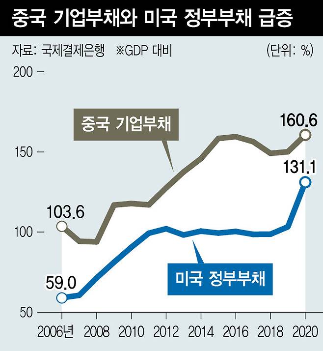 2008년 미국에서 시작한 금융위기가 전 세계로 확산하면서 2009년 세계 경제가 침체에 빠졌으나, 중국 경제는 9.4%나 성장했다. 그 뒤로도 2019년까지 중국 경제성장률은 연평균 7.6%로 매우 높았다. 기업의 투자 증가가 경제성장에 크게 기여했다. 그러나 성장 과정에서 기업 부채가 대폭 증가했다. 2008년 지디피 대비 94%였던 기업의 부채비율이 2020년에는 161%로 높아졌다. 금액으로 보면 같은 기간 4조3838억 달러에서 24조8495억 달러로 급증한 것이다. 2020년 중국의 기업 부채가 세계에서 차지하는 비중이 30%였고, 신흥국 기업 부채 중 71%나 차지했다.