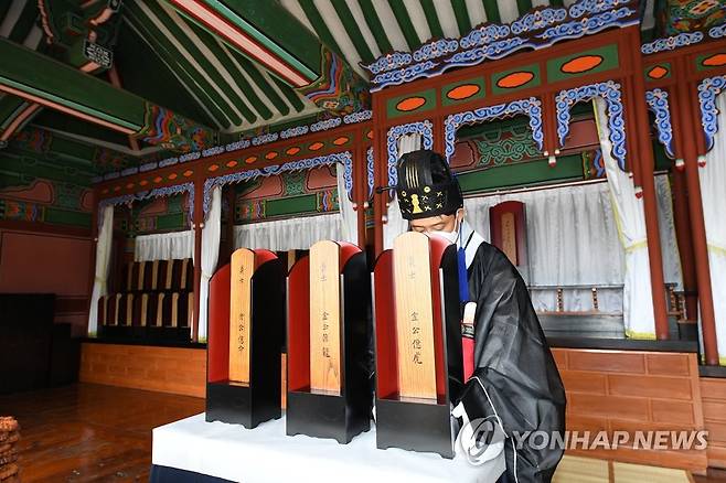 (서울=연합뉴스) 26일 오후 전북 남원시 만인의총에서 열린 제424주년 만인의사 순의제향에서 김억명, 김억룡, 김억호 3형제의 위패를 추가 배향하고 있다. 2021.9.26