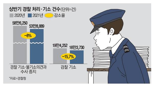 통계도 수사 지연을 간접적으로 보여준다. 대검에 따르면, 올해 상반기 경찰이 기소 혹은 불기소 의견으로 검찰에 송치하거나 수사중지를 통보한 사건은 53만8889건으로, 전년 동기(58만6250건)보다 8% 줄었다. 최종 기소건도 대폭 감소했다. 검찰은 올해 상반기 송치건 중 16만3730건을 기소해 전년(19만4252건)보다 15.7%나 줄었다. 전직 고검장 출신 변호사는 "기소건수가 15% 넘게 하락한다는 것은 사건 처리 속도가 늦어지고 있다고 보는 게 맞는다"고 했다.