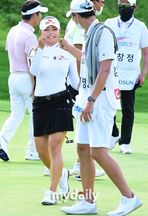 [마이데일리 = 안산(경기도) 곽경훈 기자] 김지영2가 26일 오후 경기도 안산 아일랜드 CC(파72·6,613야드)에서 진행된 한국여자프로골프(KLPGA) 투어 '엘크루-TV조선 프로 셀러브리티 2021'(총상금 6억 원, 우승상금 1억 800만 원) 3라운드 18번홀서 캐디와 하이파이브를 하고 있다.- ⓒ마이데일리(www.mydaily.co.kr). 무단전재&재배포 금지 -