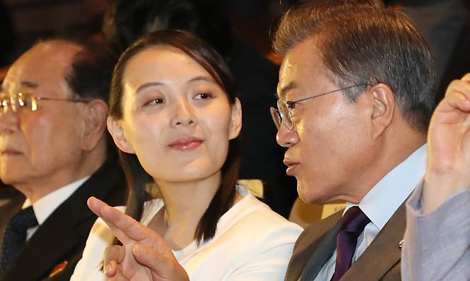 | 문재인 대통령이 2018년 2월 방한중이던 김여정 북한 노동당 부부장과 국립중앙극장에서 북한 삼지연 관현악단 공연을 보며 대화를 나누고 있다. 세계일보 자료사진 |