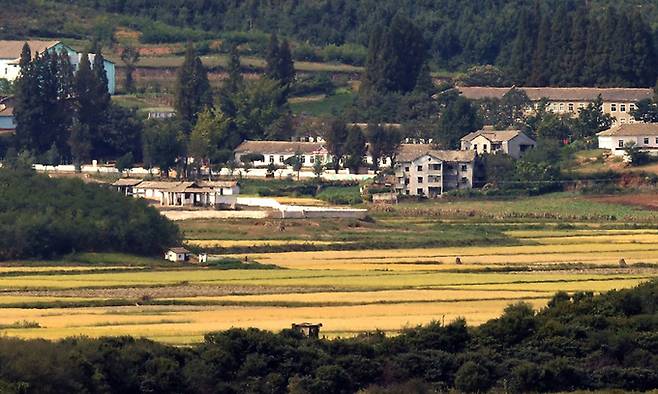 | 노랗게 물든 北 들녘 가을 추수철을 앞둔 26일 경기 파주시 오두산 통일전망대에서 바라본 북한 황해북도 개풍군 들녘이 노랗게 물들어 있다. 김여정 북한 노동당 부부장은 전날까지 이틀 연속 남북관계와 관련해 남북공동연락사무소 재설치, 남북정상회담 가능성까지 거론하는 담화를 발표했다. 파주=이재문 기자 |
