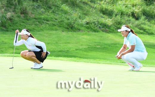 [마이데일리 = 안산(경기도) 곽경훈 기자] 김지영2와 유해란이 26일 오후 경기도 안산 아일랜드 CC(파72·6,613야드)에서 진행된 한국여자프로골프(KLPGA) 투어 '엘크루-TV조선 프로 셀러브리티 2021'(총상금 6억 원, 우승상금 1억 800만 원) 3라운드 18번 홀에서 홀컵을 바라보고 있다.- ⓒ마이데일리(www.mydaily.co.kr). 무단전재&재배포 금지 -