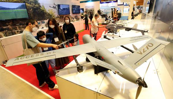 '2021 무인이동체산업엑스포'가 26일 서울 강남구 코엑스에서 열려 관람객들이 행사장에 전시된 최신형 드론들을 둘러보고 있다.