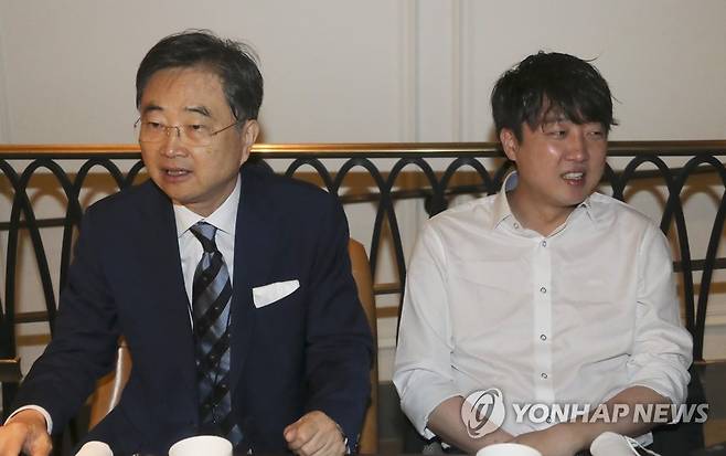 (서울=연합뉴스) 국민의힘 이준석 대표(오른쪽)가 25일(현지시간) 미국 뉴욕 인터콘티넨탈 뉴욕 바클레이 호텔에서 조현 주 UN 대사와 조찬 간담회를 하고 있다. 2021.9.26 [국민의힘 제공. 재판매 및 DB 금지]