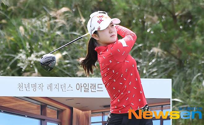 이날 프로골퍼 이승연이 1번홀에서 티샷을 날리고 있다.