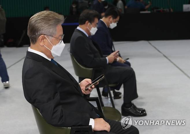(완주=연합뉴스) 최영수 기자 = 26일 전북 완주군 우석대학교 체육관에서 열린 더불어민주당 대선 후보 선출을 위한 전북 합동연설회 후 후보들이 경설결과를 휴대전화로 확인하고 있다. 왼쪽부터 이재명, 이낙연, 박용진 후보