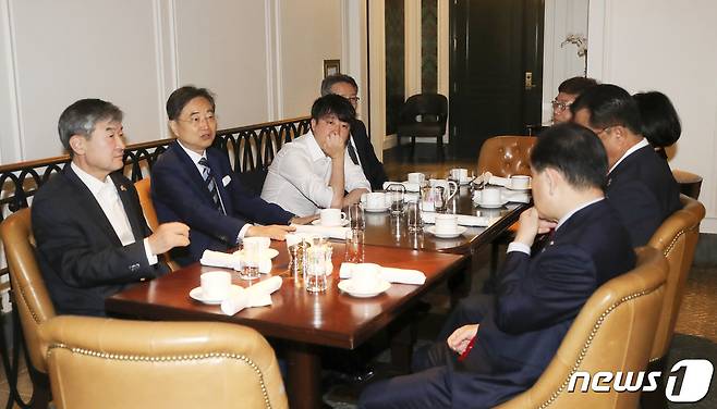 (서울=뉴스1) 박지혜 기자 = 이준석 국민의힘 대표와 방미의원단이 25일(현지시간) 미국 뉴욕 인터콘티넨탈 뉴욕 바클레이 호텔에서 조현 주UN대사와 조찬 간담회를 하고 있다. (국민의힘 제공) 2021.9.26/뉴스1