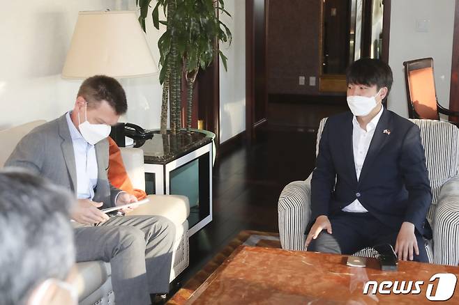 (서울=뉴스1) 박지혜 기자 = 이준석 국민의힘 대표가 25일(현지시간) 미국 뉴욕 인터콘티넨탈 뉴욕 바클레이 호텔에서 월스트리트저널과 인터뷰를 갖고 있다. (국민의힘 제공) 2021.9.26/뉴스1