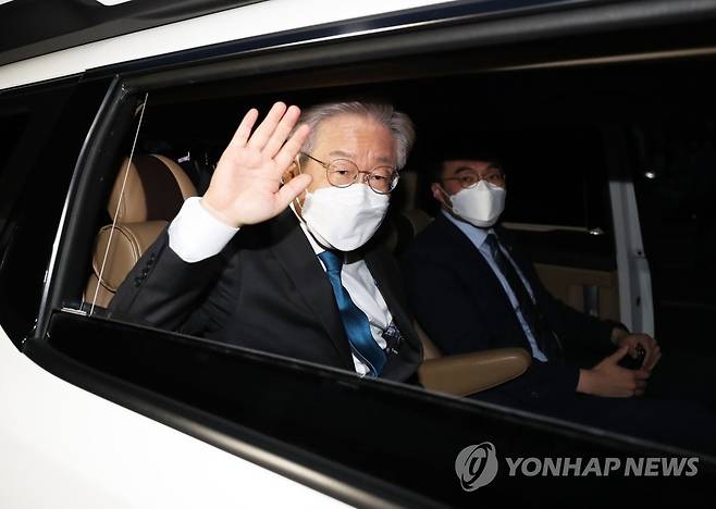 (완주=연합뉴스) 최영수 기자 = 더불어민주당 대선주자인 이재명 경기지사가 26일 전북 완주군 우석대학교 체육관에서 열린 더불어민주당 대선 후보 선출을 위한 전북 합동연설회를 마친 후 차량을 타고 이동하며 손을 흔들고 있다. 2021.9.26
