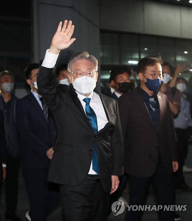(완주=연합뉴스) 최영수 기자 = 더불어민주당 대선주자인 이재명 경기지사가 26일 전북 완주군 우석대학교 체육관에서 열린 더불어민주당 대선 후보 선출을 위한 전북 합동연설회장을 나서며 손을들어 인사하고 있다. 2021.9.26