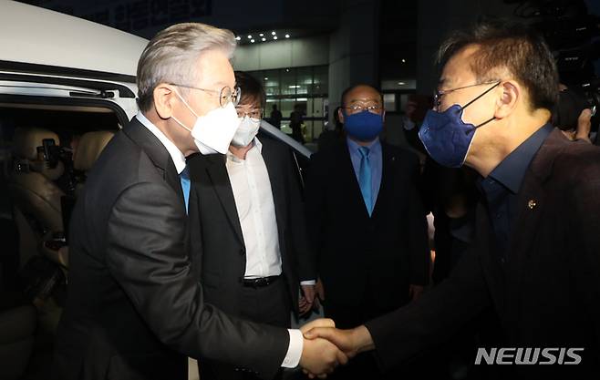 [완주=뉴시스] 전북사진기자단 = 더불어민주당 대선 후보 선출 전북 합동 연설회가 열린 26일 전북 완주군 우석대학교에서 투표 결과 발표를 마친 이재명 후보가 자신을 지지해준 김윤덕 의원과 악수를 나누고 있다. 2021.09.26. pmkeul@newsis.com