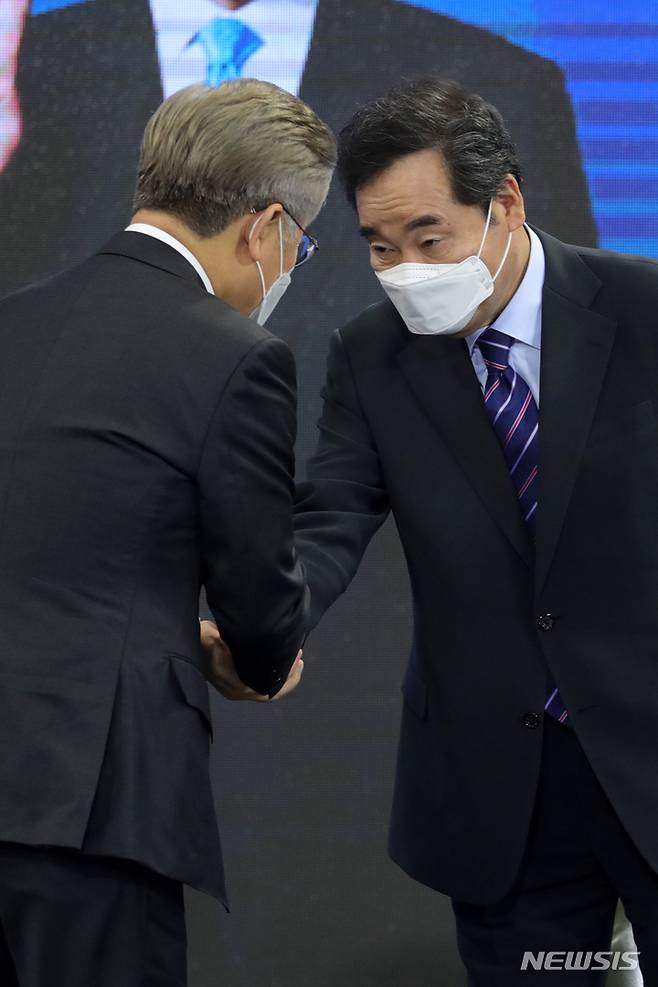 [완주=뉴시스] 전북사진기자단 = 더불어민주당 대선 후보 선출 전북 합동 연설회가 열린 26일 전북 완주군 우석대학교에서 투표 결과 발표를 마친 이재명 후보와 이낙연 후보가 악수를 나누고 있다. 2021.09.26. pmkeul@newsis.com