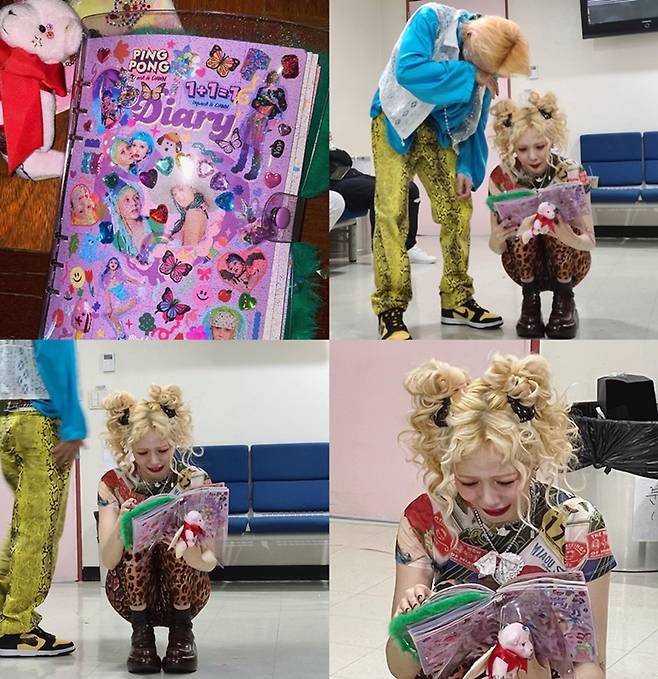 사진 속 현아는 한 다이어리를 보고 있다. 다이어리를 읽던 현아는 울컥한 듯 눈물을 흘리고 있다. 이어진 사진에서는 던 또한 현아 옆에 서서 눈물을 닦고 있는 모습이다