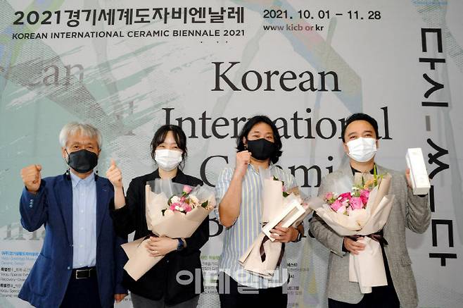 [이데일리 김태형 기자] 최연(왼쪽부터) 한국도자재단 대표이사가 24일 경기도 이천 경기도자미술관에서 열린 ‘2021경기세계도자비엔날레’ 국제공모전 시상식에서 황재원(입선), 오제성(KICB레지던시상), 주세균(한국작가 은상)씨와 기념촬영을 하고 있다.