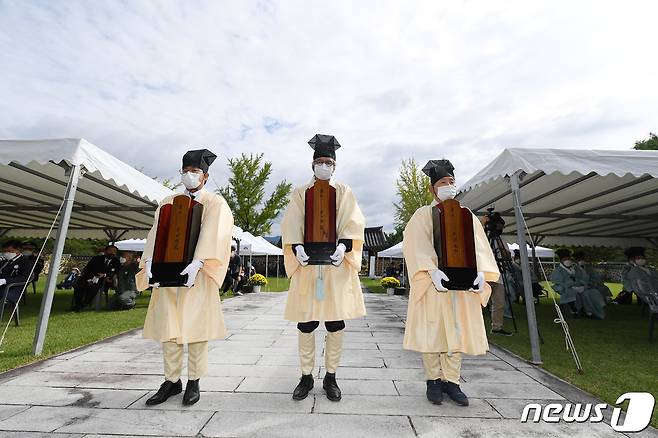 (서울=뉴스1) 박지혜 기자 = 26일 오후 전북 남원시 만인의총에서 열린 제424주년 만인의사 순의제향에서 김억명, 김억룡, 김억호 3형제의 위패를 추가 배향하며 예를 올리고 있다. (문화재청 제공) 2021.9.26/뉴스1