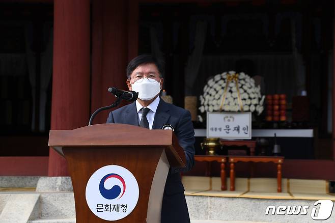 (서울=뉴스1) 박지혜 기자 = 김현모 문화재청장이 26일 오후 전북 남원시 만인의총에서 열린 제424주년 만인의사 순의제향에서 인사말을 하고 있다. (문화재청 제공) 2021.9.26/뉴스1