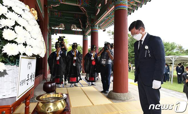 (서울=뉴스1) 박지혜 기자 = 김현모 문화재청장이 26일 오후 전북 남원시 만인의총에서 열린 제424주년 만인의사 순의제향에서 헌화 한 뒤 묵념을 하고 있다. (문화재청 제공) 2021.9.26/뉴스1