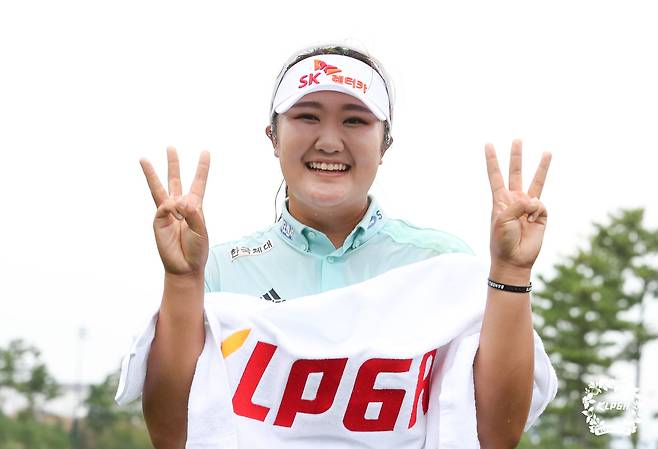 (서울=뉴스1) 박지혜 기자 = 유해란이 26일 경기 안산 대부도 아일랜드CC에서 열린 KLPGA투어 엘크루-TV조선 프로 셀러브리티에서 우승 한 포즈를 취하고 있다. (KLPGA 제공) 2021.9.26/뉴스1